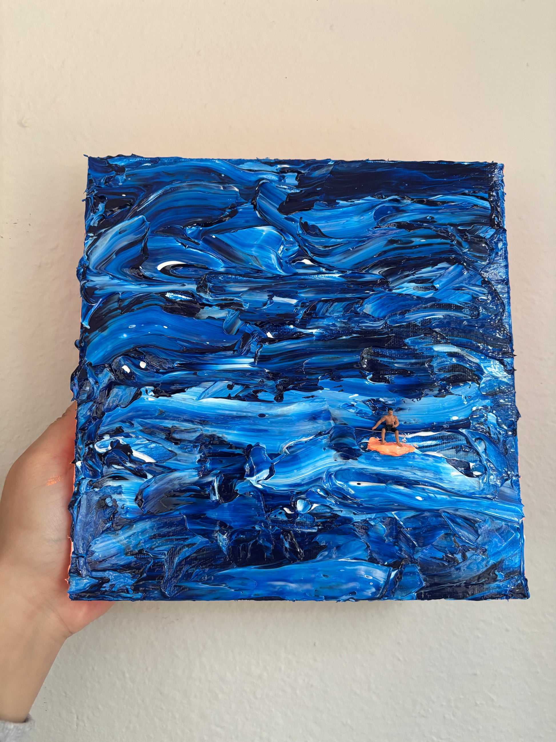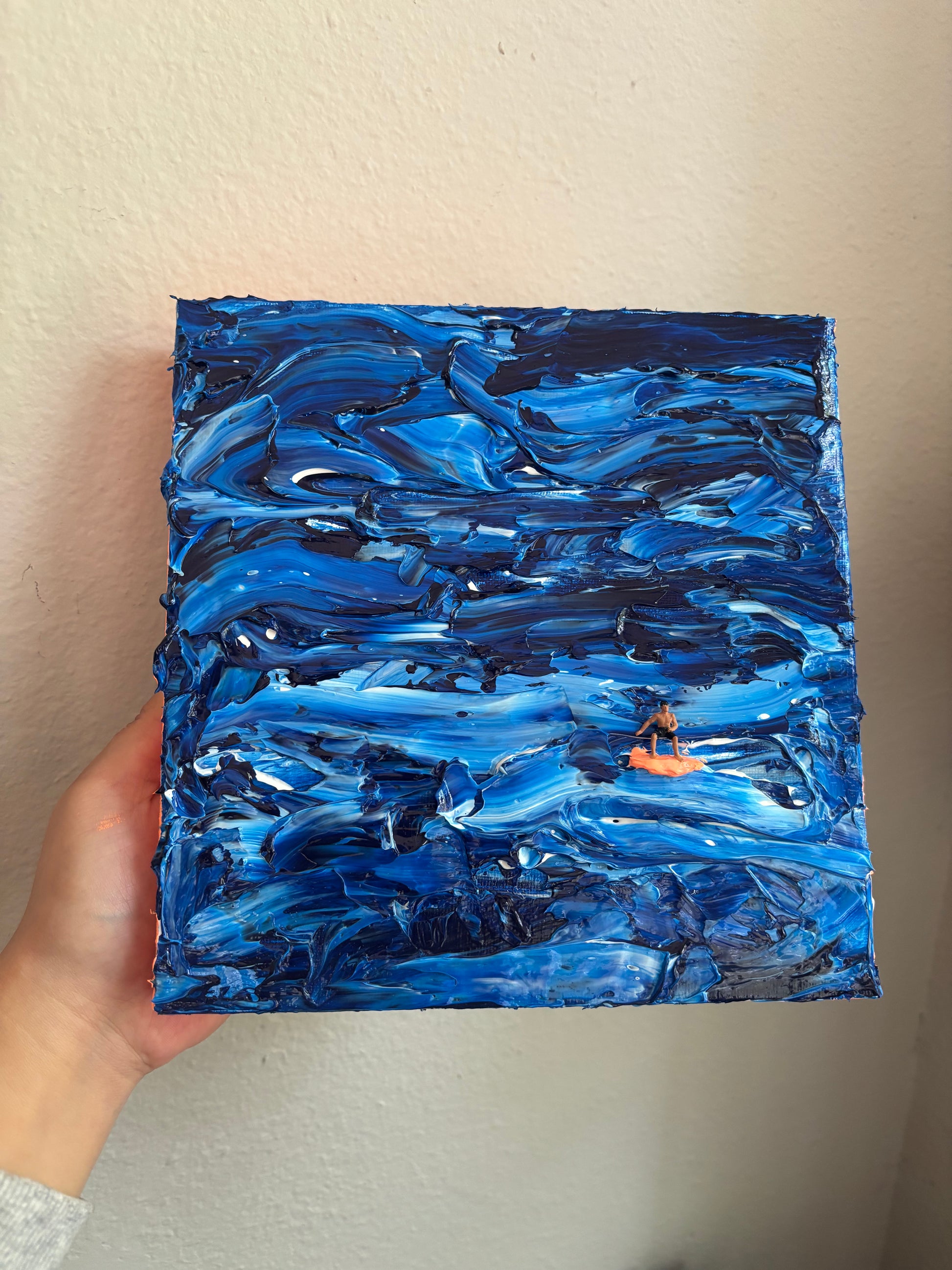 Ocean palette knife thick acrylic painting with little surfer dude