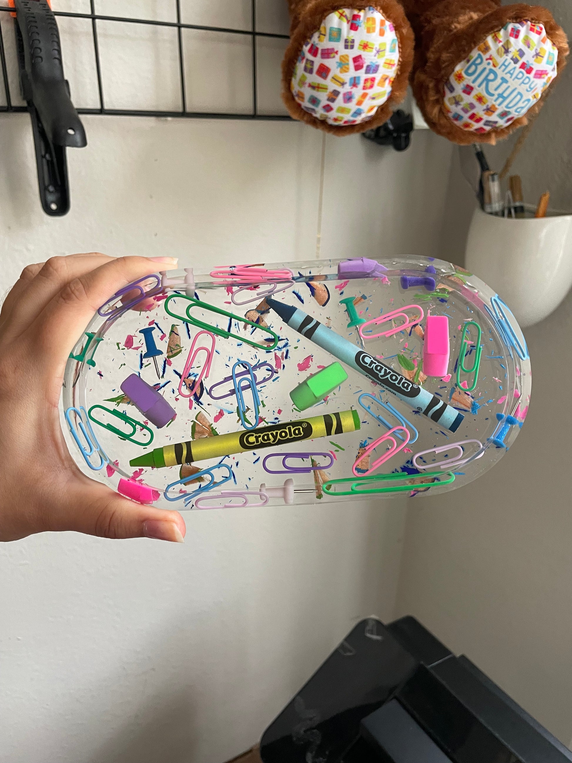 Al finalizar la compra hay un cuadro de comentarios, hágamelo saber el NOMBRE/FRASE en la bandeja, de qué color (dorado o plateado) y el fondo predeterminado son las virutas de lápiz de color.