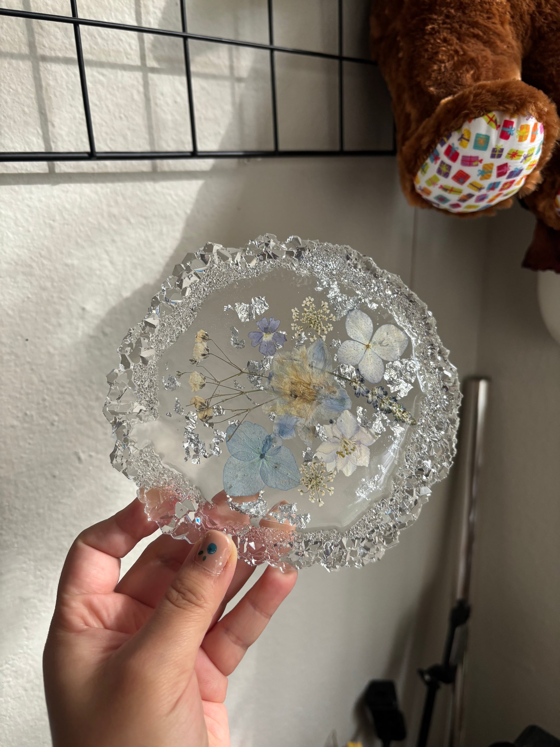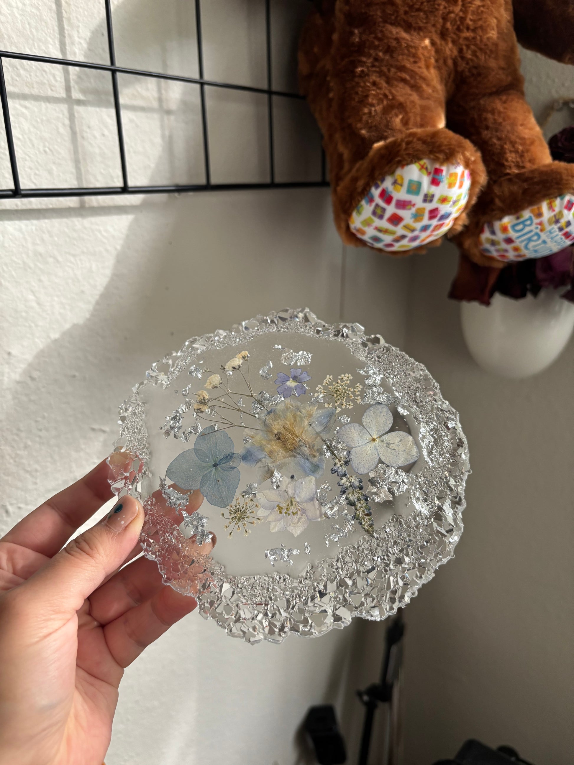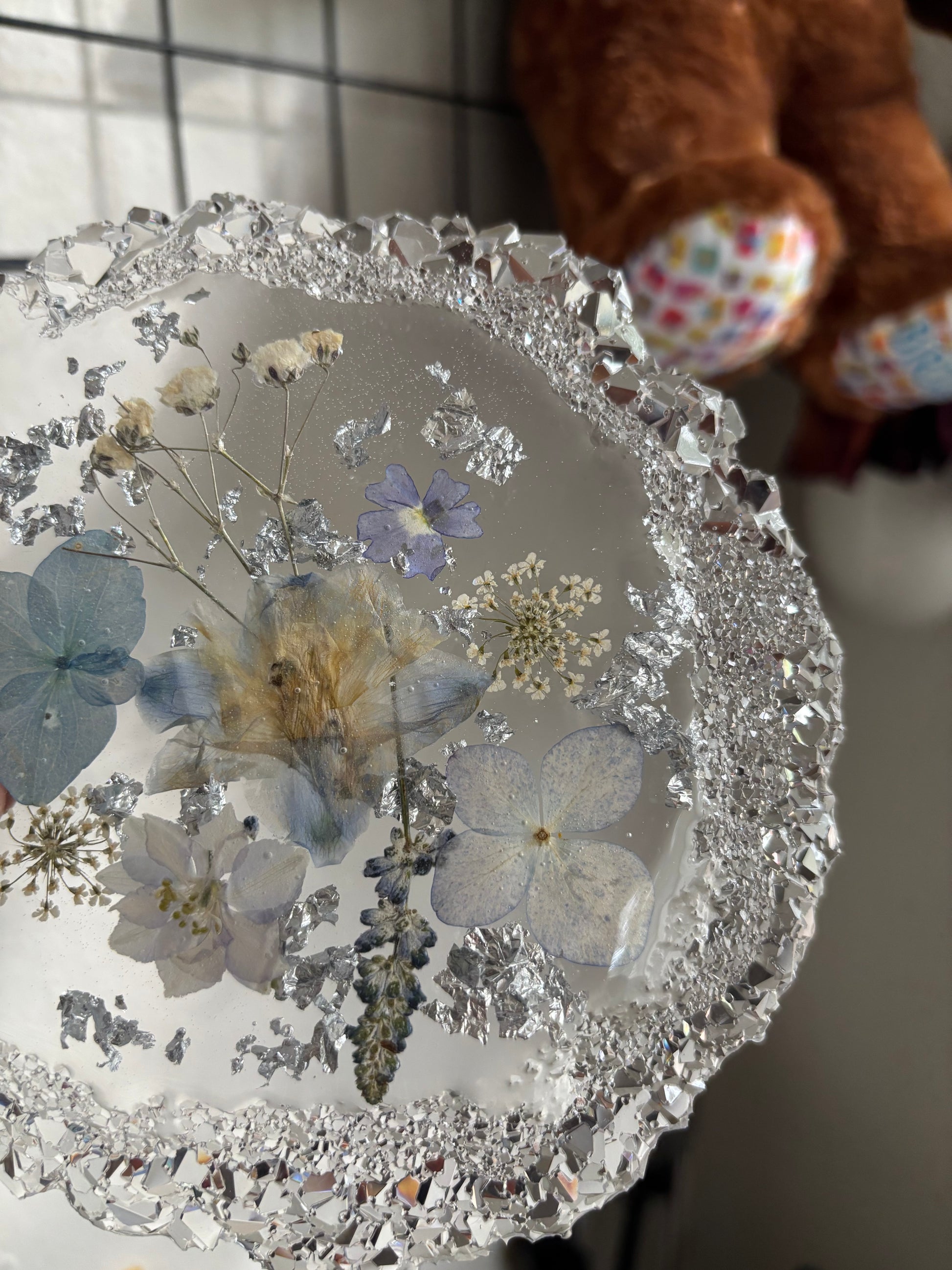 Made with real flowers and silver flakes