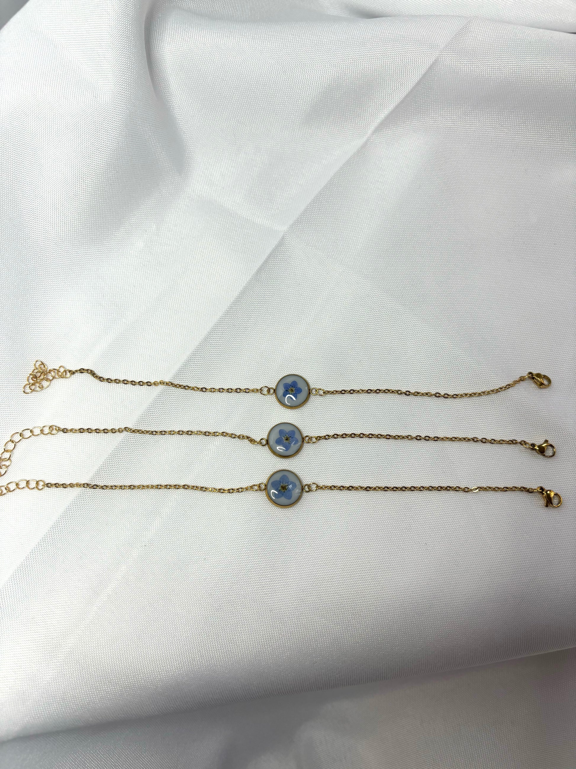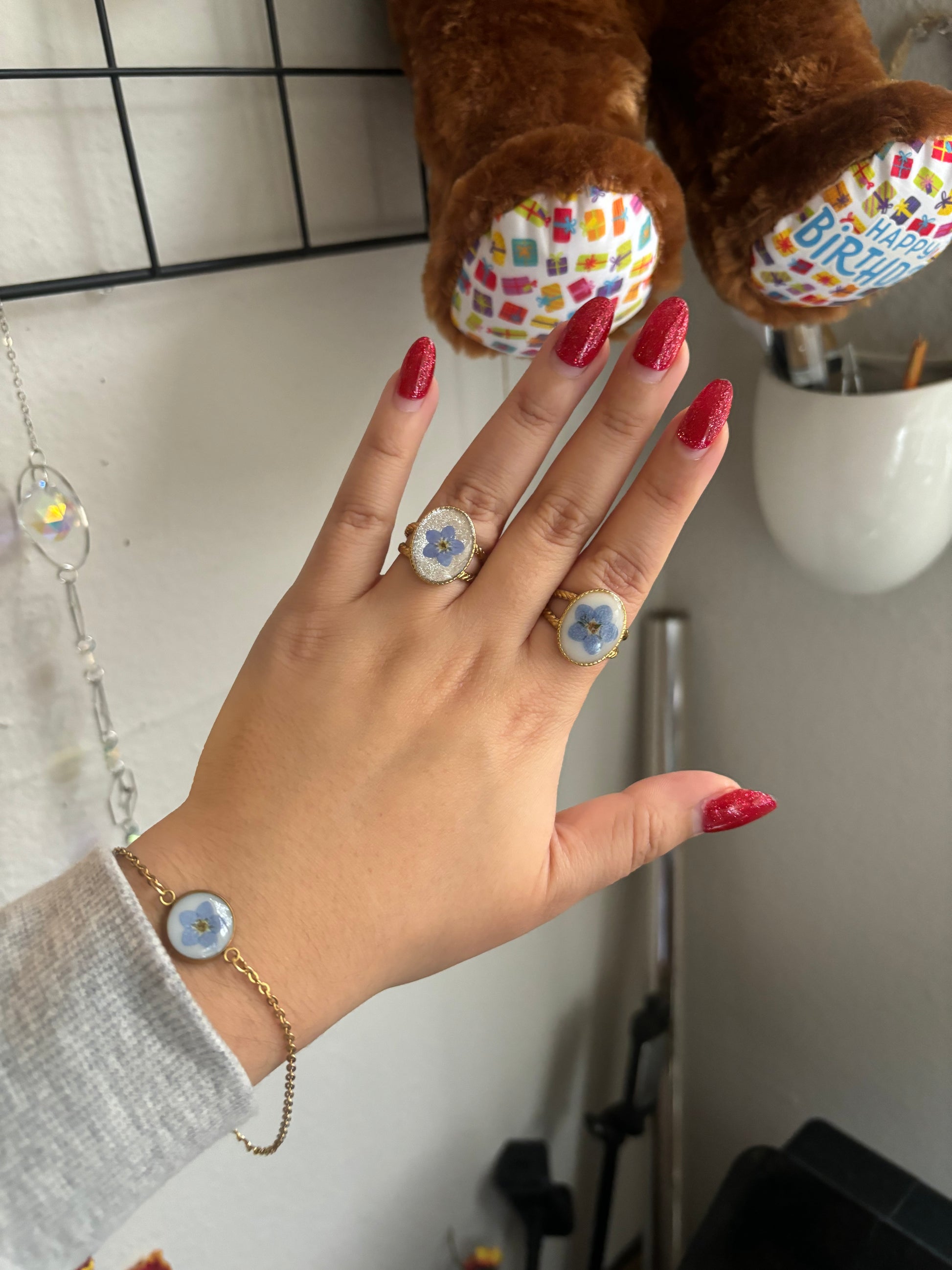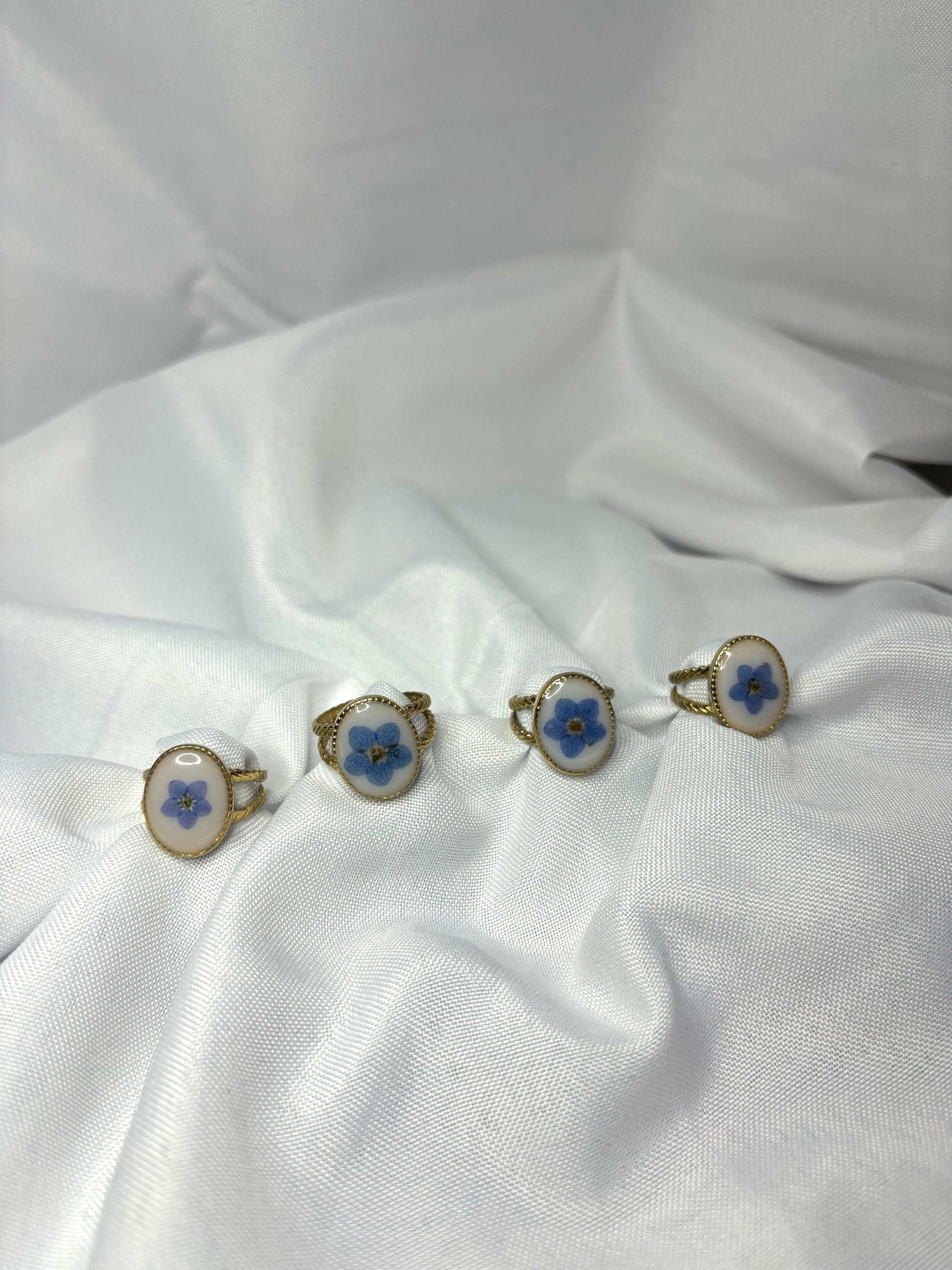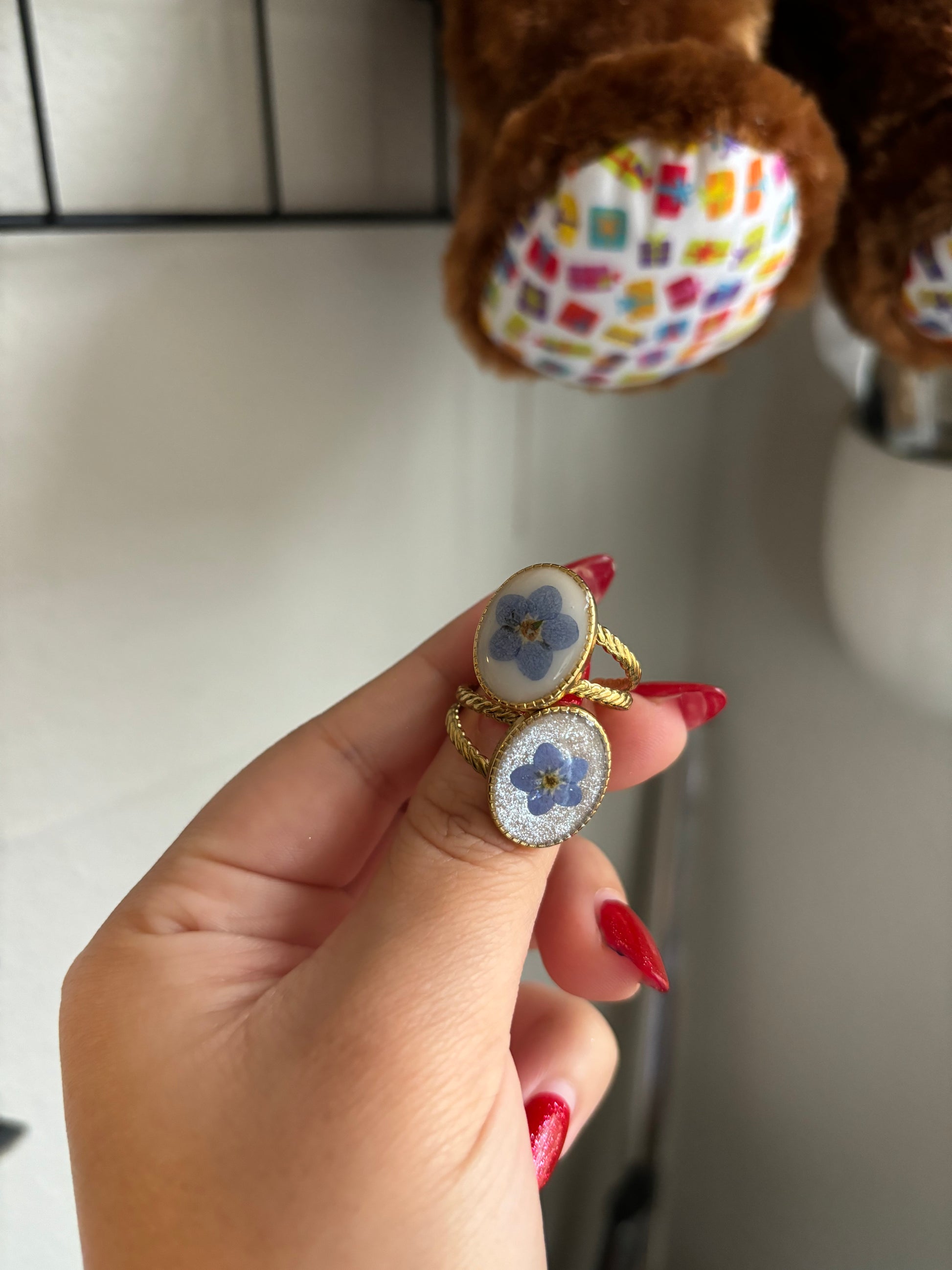 Adjustable gold plated ring handcrafted with real forget-me-not flowers sealed in resin.