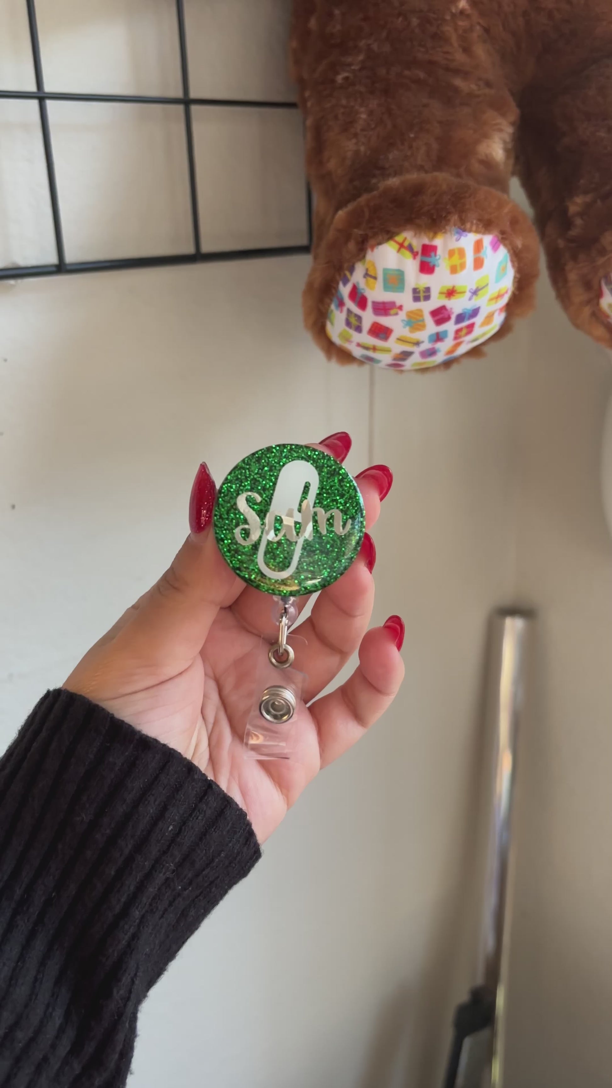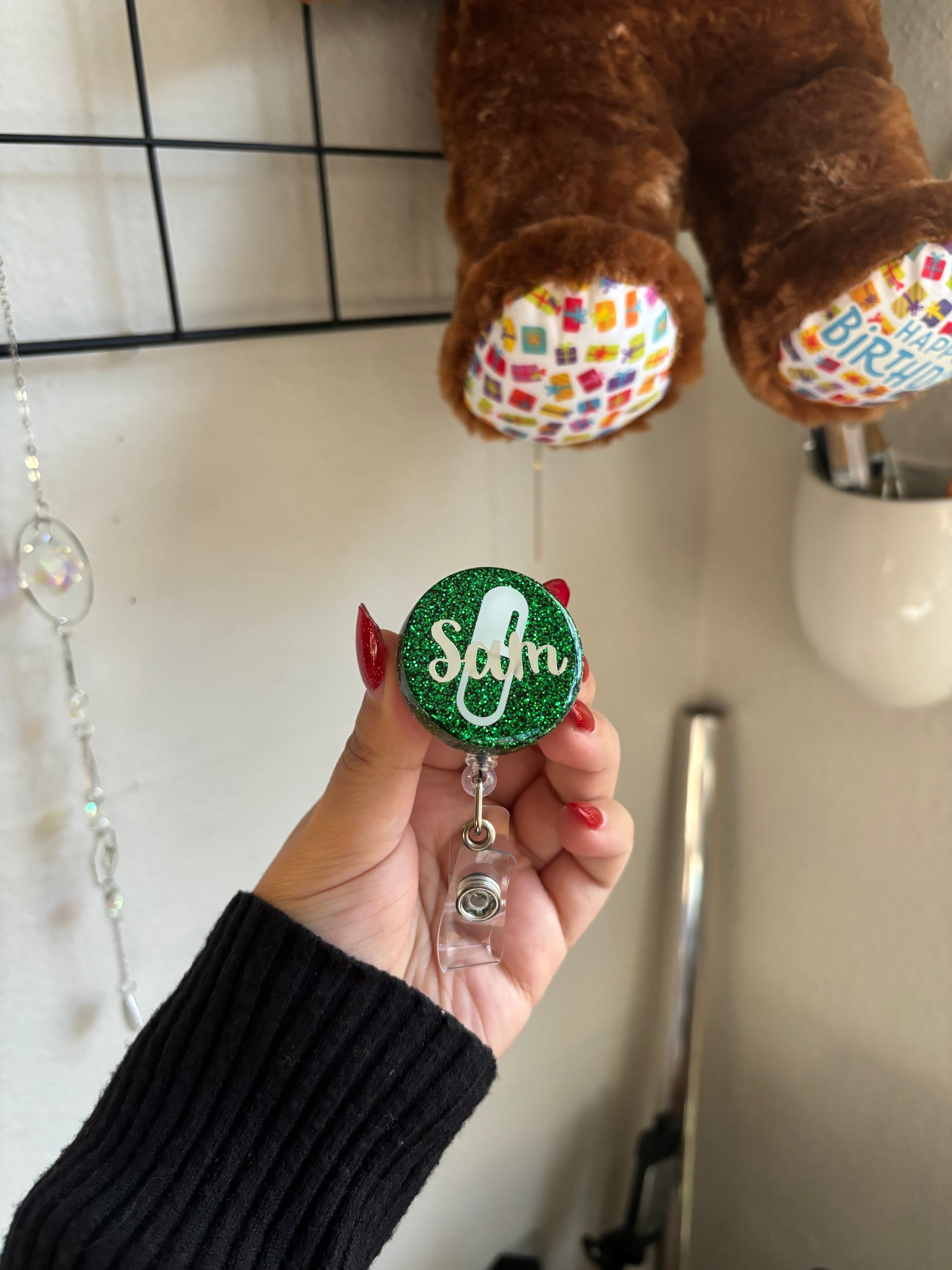 Glitter badge reels come in 7 different color backgrounds: Gunmetal, silver, gold, blue, purple, pink & green!