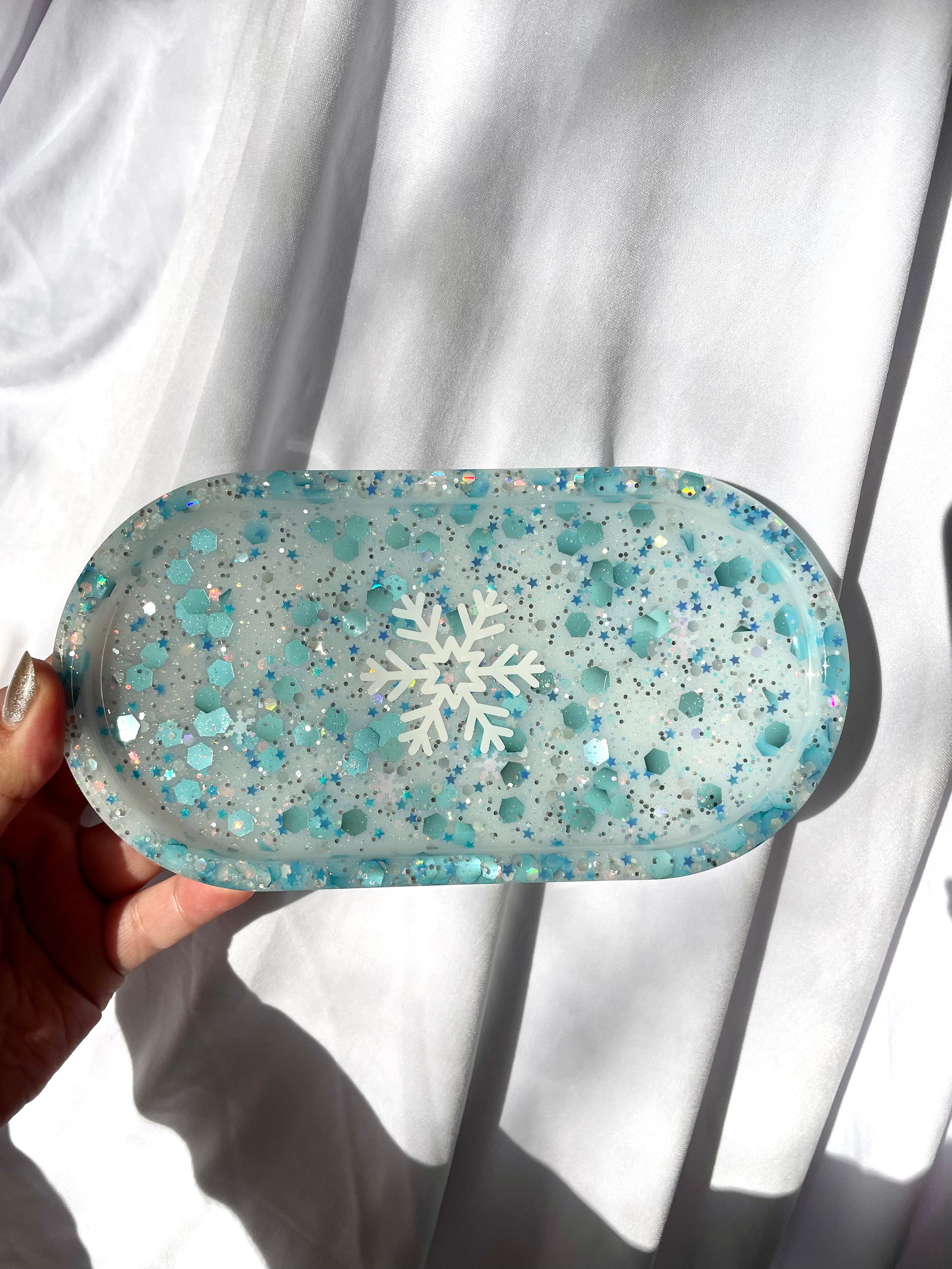 Bandeja de resina de copo de nieve con purpurina