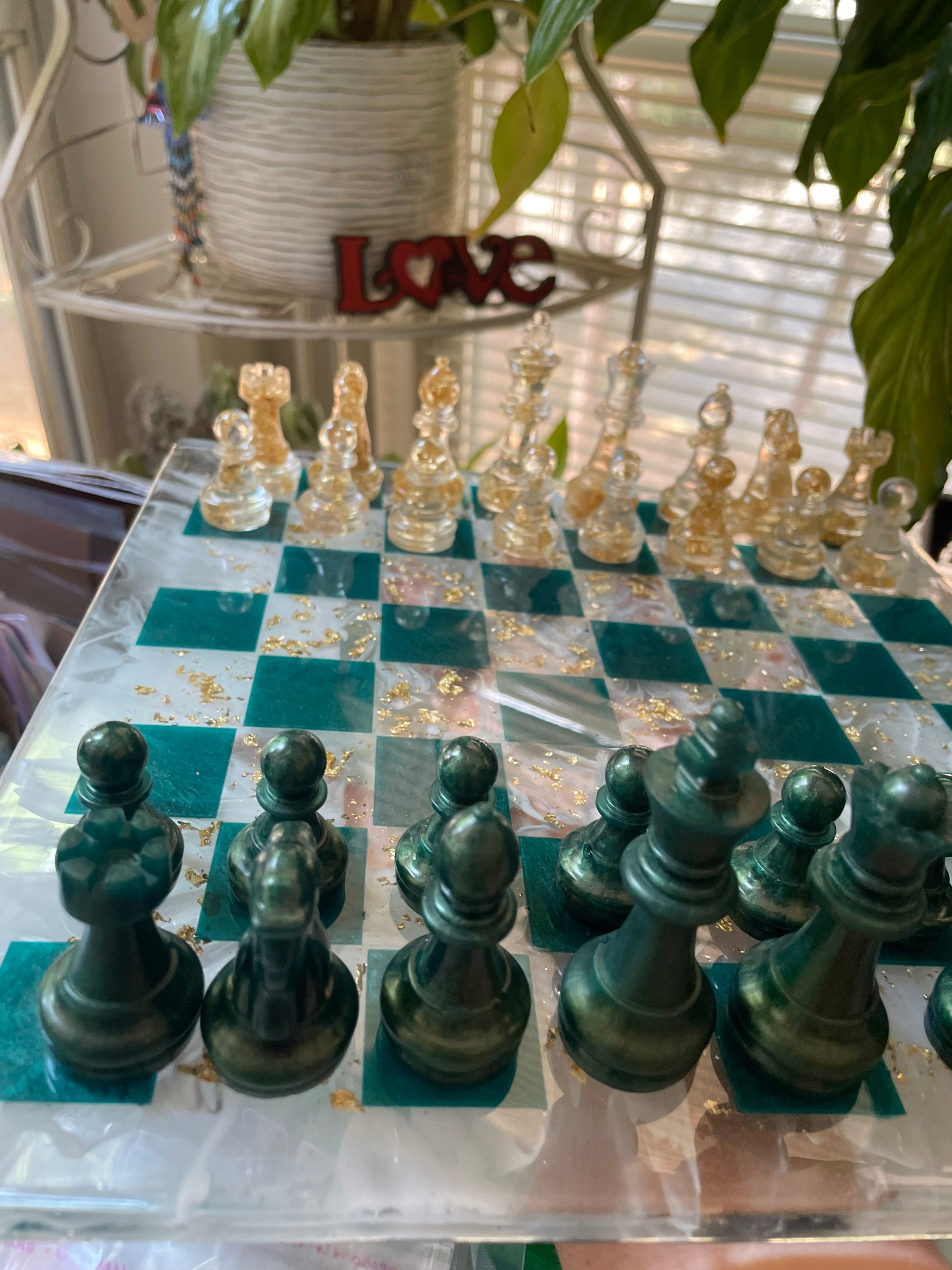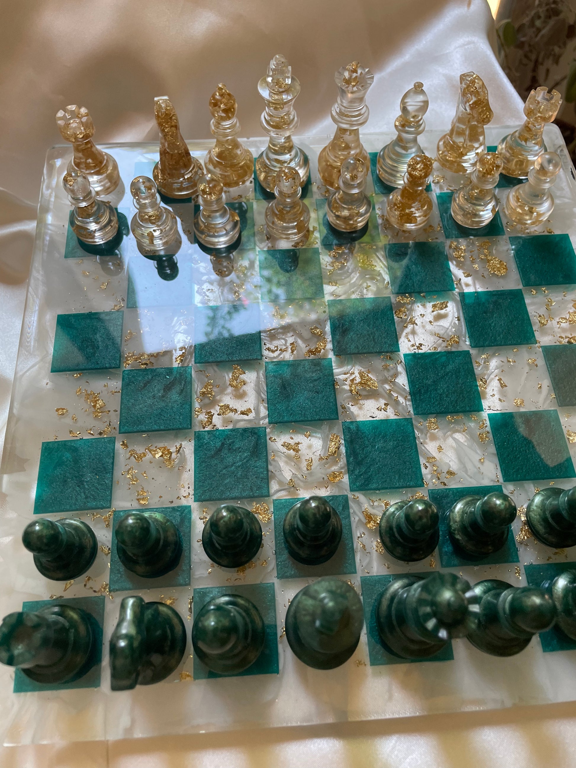 Tablero de ajedrez de mármol verde esmeralda y oro.
